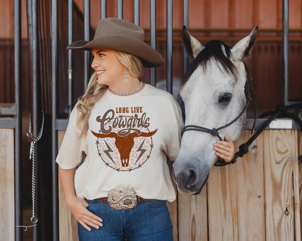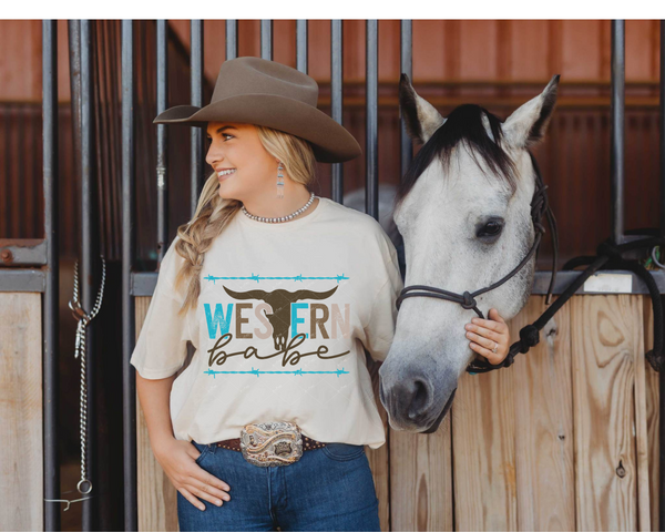 Western Babe (cow skull, barbwire, block distressed lettering, blue, brown, tan) DTF TRANSFER
