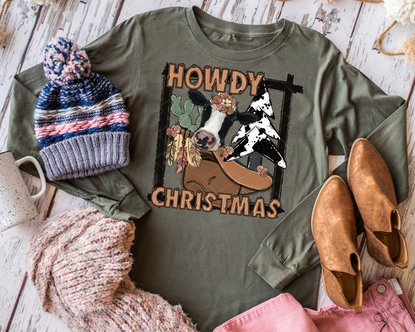 Howdy Christmas Country Cow Cow Christmas Tree Cactus Boho 1058 DTF TRANSFER