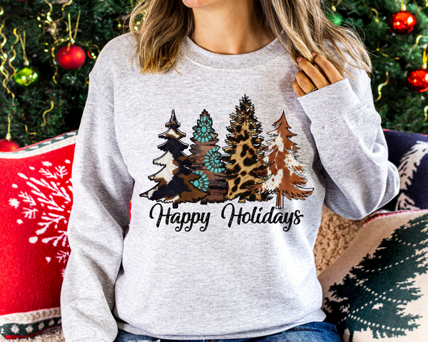 Happy Holiday's Western Cow Print Christmas Trees (Black Font) 8439 DTF TRANSFER