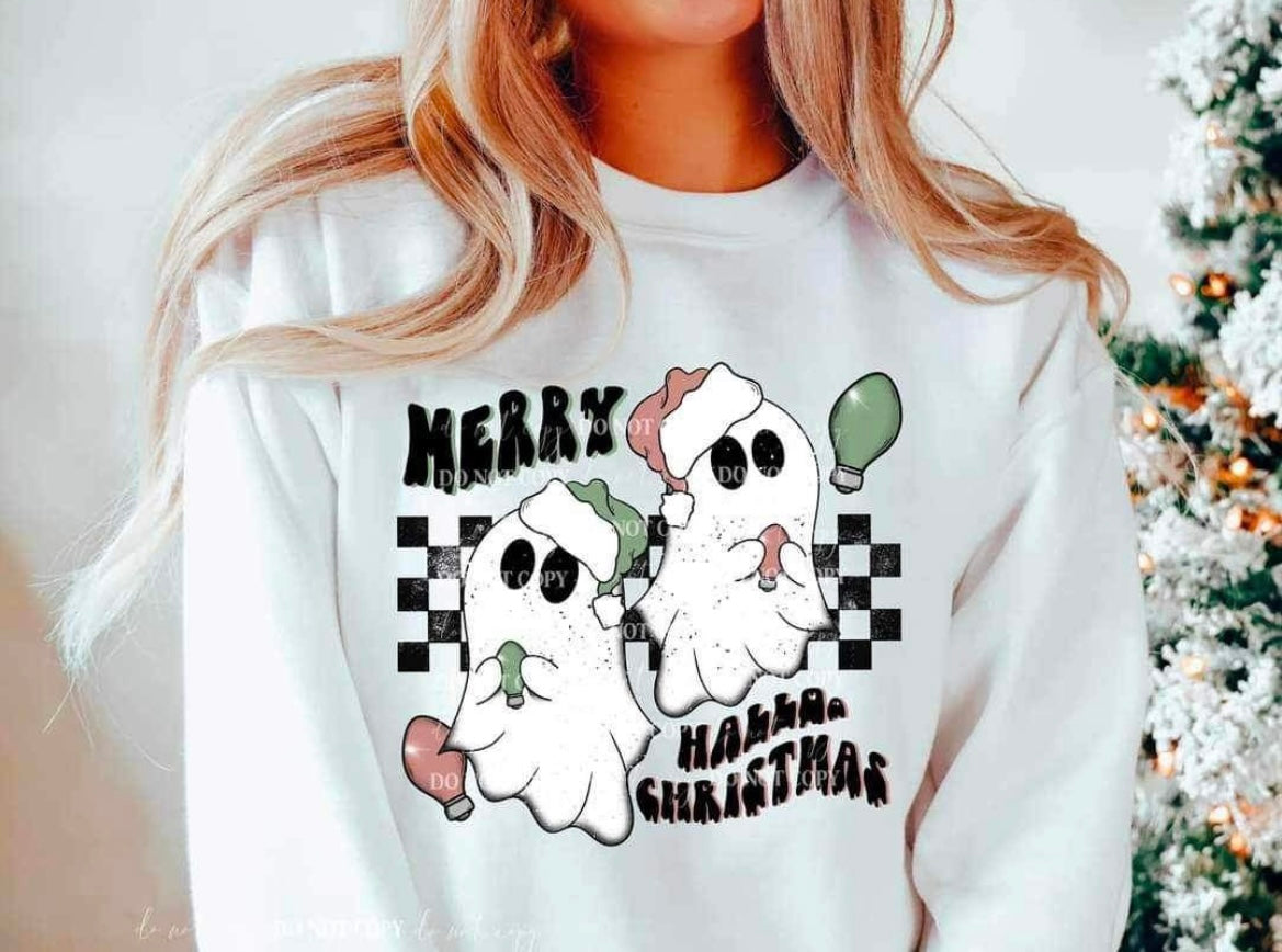 Merry halloo Christmas two ghosts checkered background SLEEVE NOT INCLUDED 10330 DTF TRANSFER