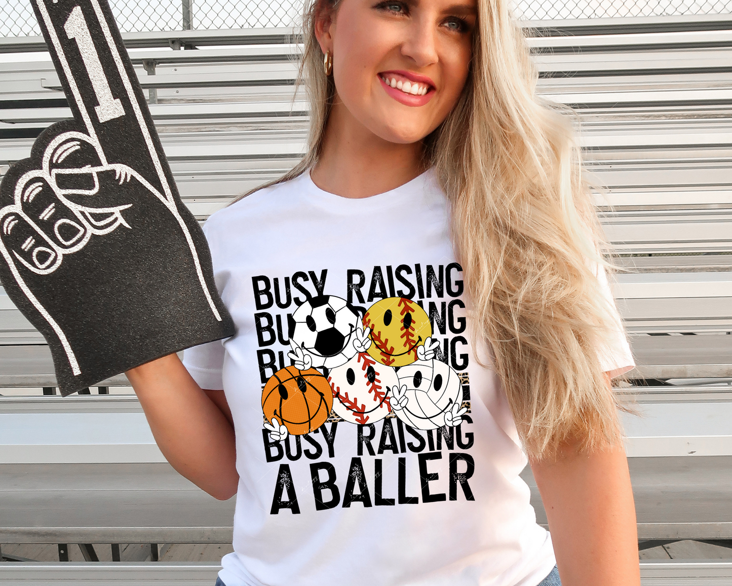 Busy Raising A Baller (sports balls, black block distressed lettering) DTF TRANSFER