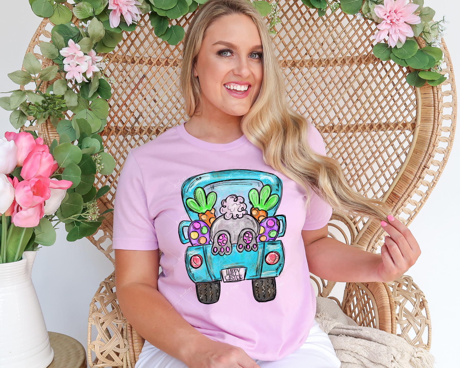 Happy Easter, bunny butt, carrots, easter eggs in back of blue pickup truck 112703 DTF TRANSFER