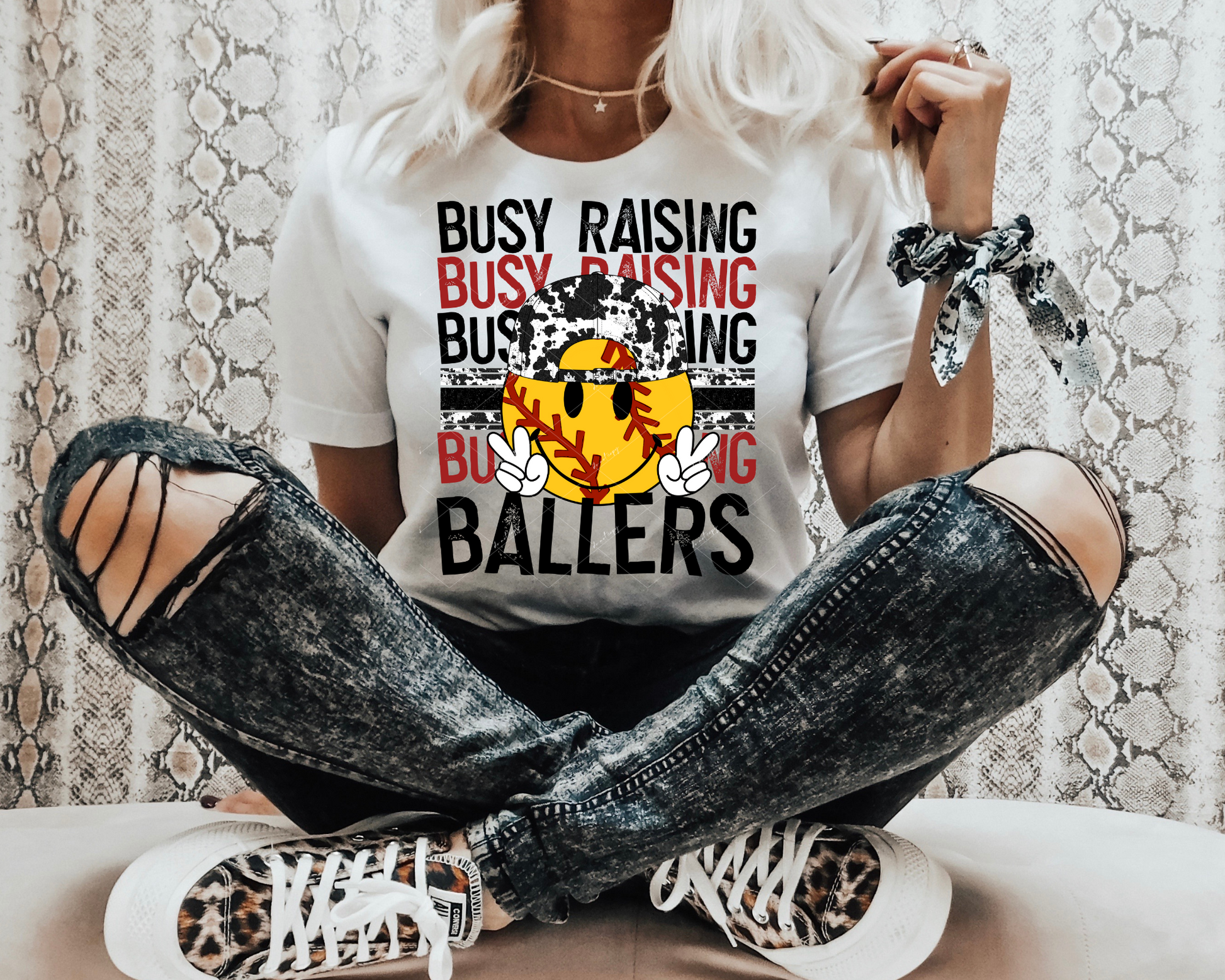 Busy Raising Ballers (yellow soft ball, black, and red block distressed lettering) DTF TRANSFER