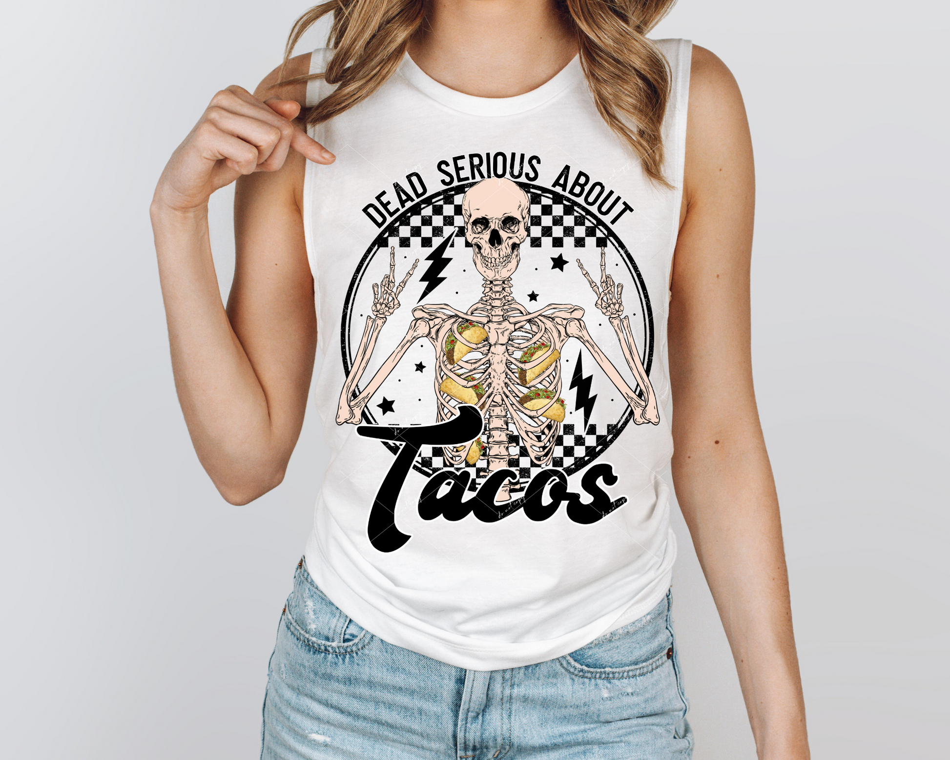 Dead Serious About Tacos (skeleton filled with tacos, black & white checker, lightning bolts) 9040 DTF TRANSFER