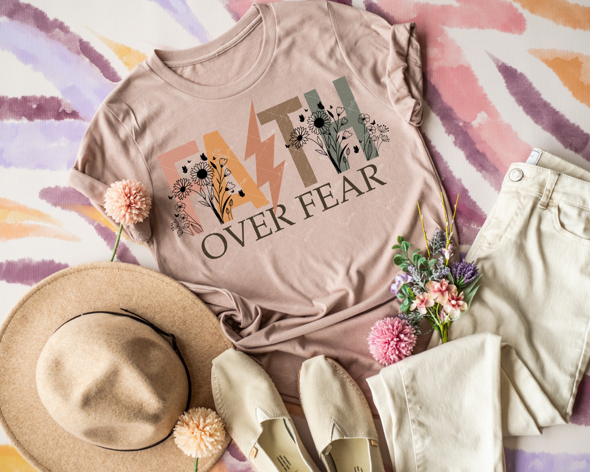 Faith Over Fear lightning bolt (pastel earth tones, wildflower black outline) 783 DTF TRANSFER
