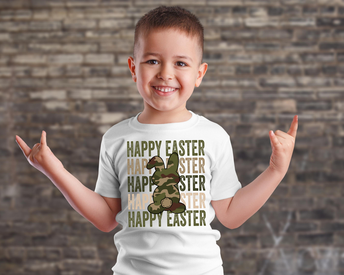 Happy Easter Happy Easter Happy Easter Happy Easter Happy Easter (block lettering, camo bunny back, camo colors) 1495 DTF TRANSFER