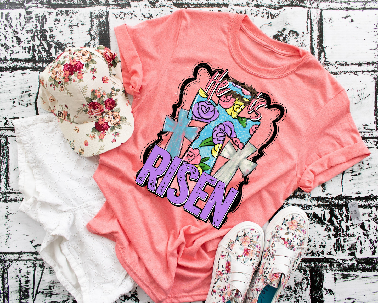 He is Risen (three cross blue & silver, floral fill, purple block lettering, black frame) 1947 DTF TRANSFER