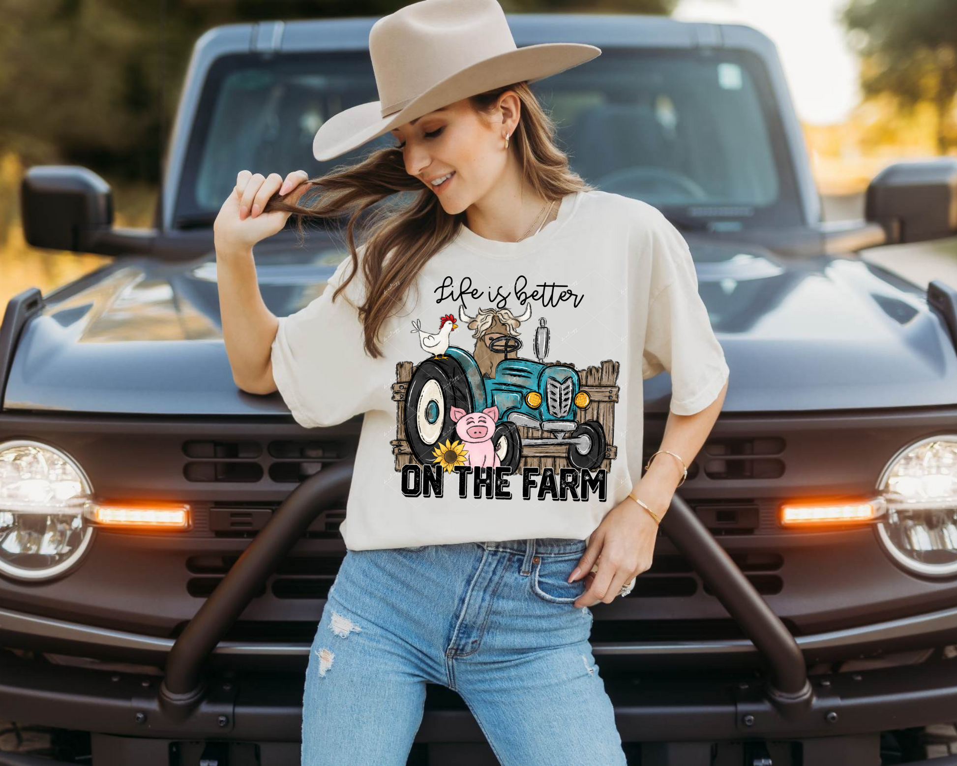 Life Is Better On The Farm (turquoise tractor, pig, chicken, heifer, wooden fence, black lettering) 9048 DTF TRANSFER