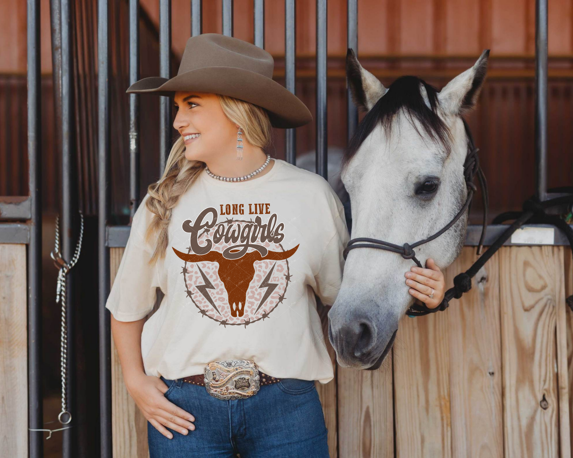 Long Live Cowgirls (circle of barbwire filled with leopard print, cow skull, lightning bolts) DTF TRANSFER