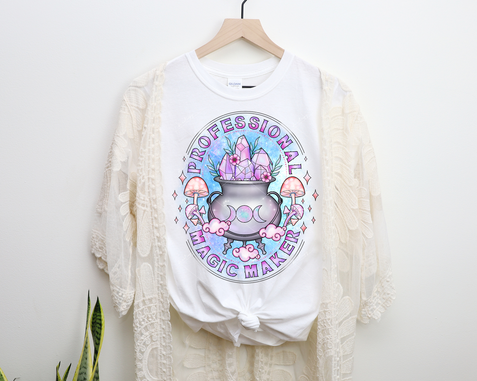 Professional Magic Maker (cauldron filled with crystals, mushrooms, moons, purple, coral, blue, pink colors) 1434 DTF TRANSFER
