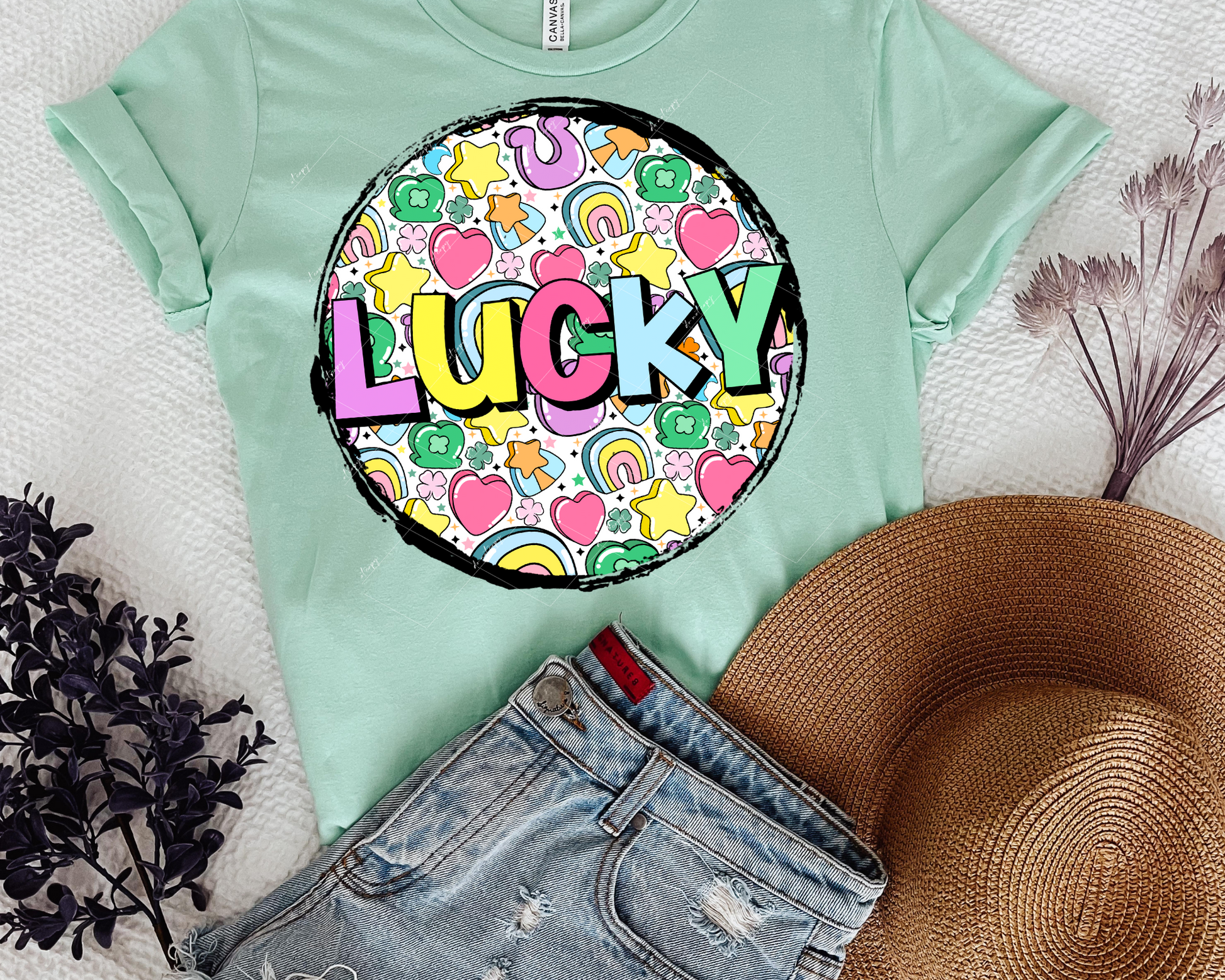 Lucky (St. Patrick elements, circle with back frame, bright pastel colors) DTF TRANSFER