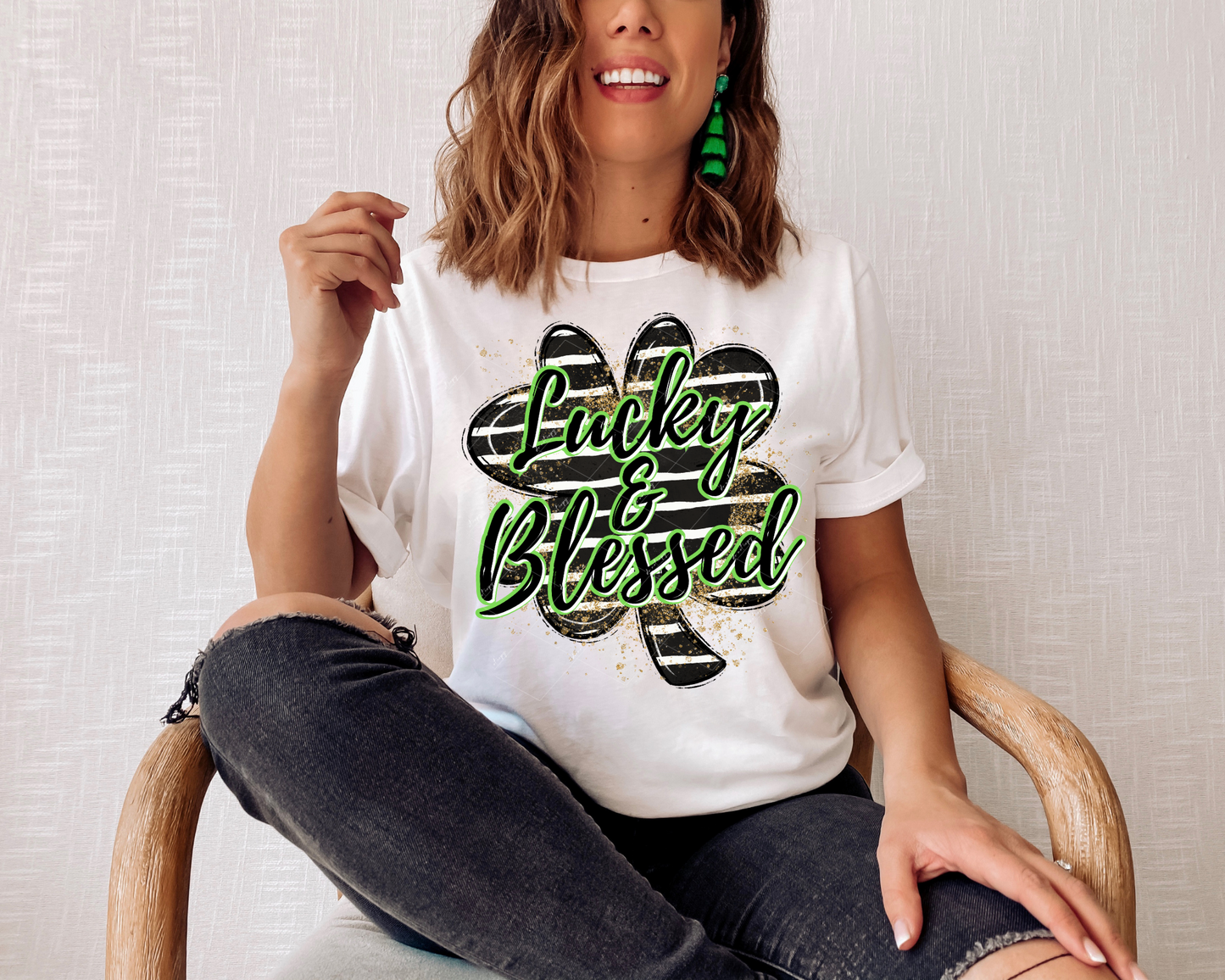 Lucky & Blessed (black striped clover, black & green handwriting lettering) DTF TRANSFER