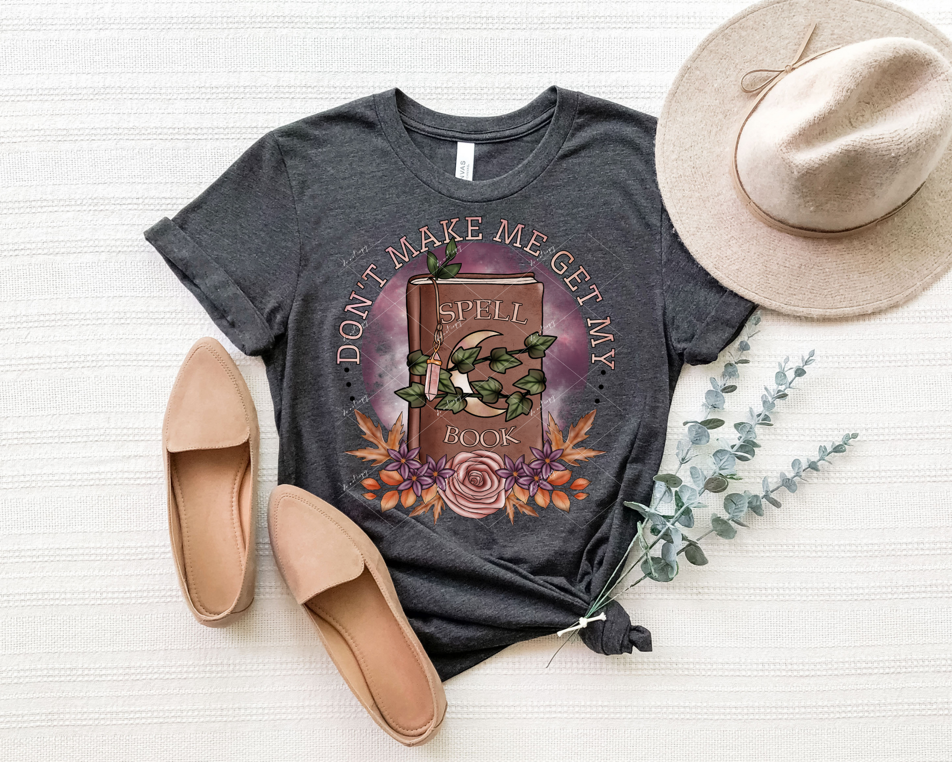 Don't Make Me Get My Spell Book (book, crescent moon, crystal, ivy, floral spray, oranges and purple colors) 1421 DTF TRANSFER