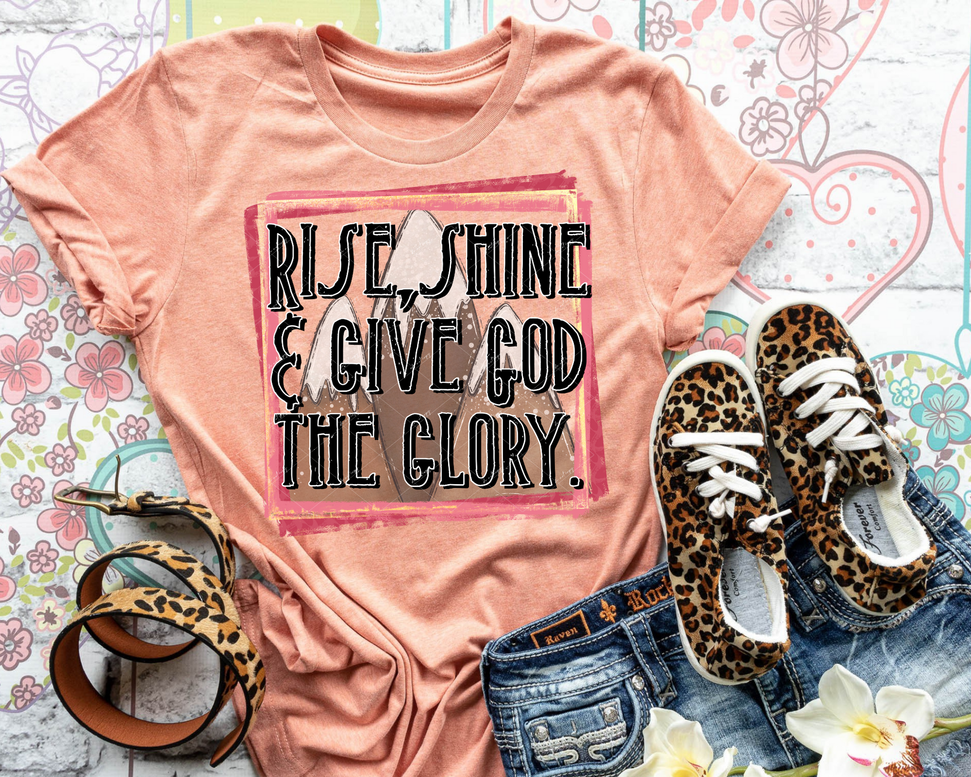 Rise,Shine & Give God The Glory. (black block letters with white outline, mountain background, coral color square frame) DTF TRANSFER