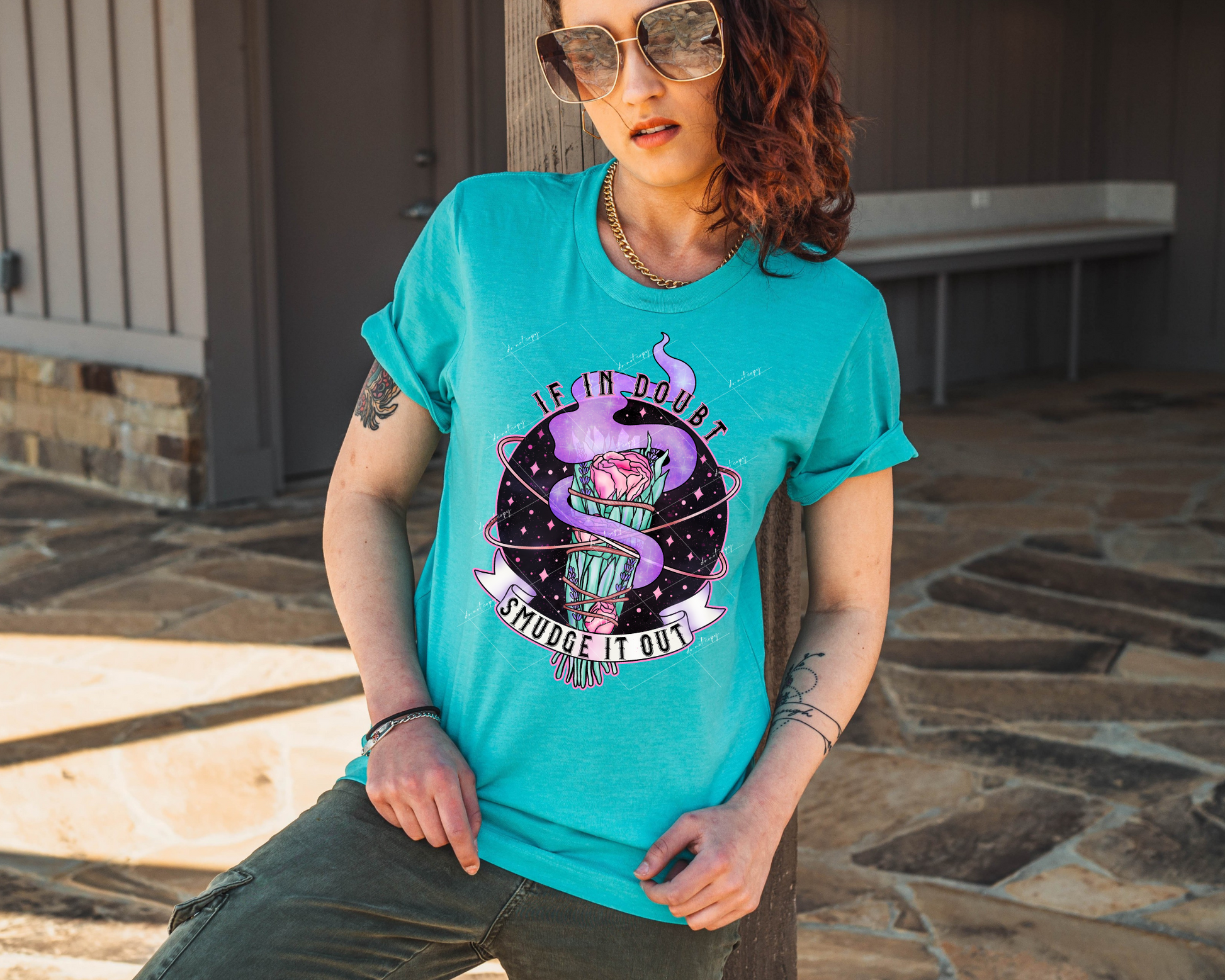 If In Doubt Smudge It Out (smudge stick, roses, black round background, purple smoke, stars) 714 DTF TRANSFER