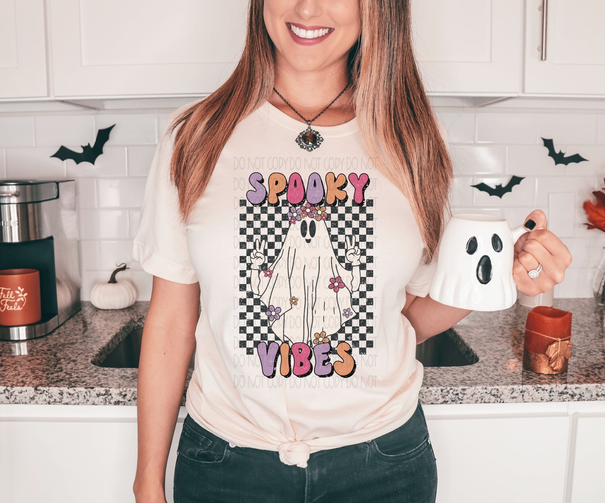 Spooky vibes groovy ghost checkered background 2735 DTF TRANSFER