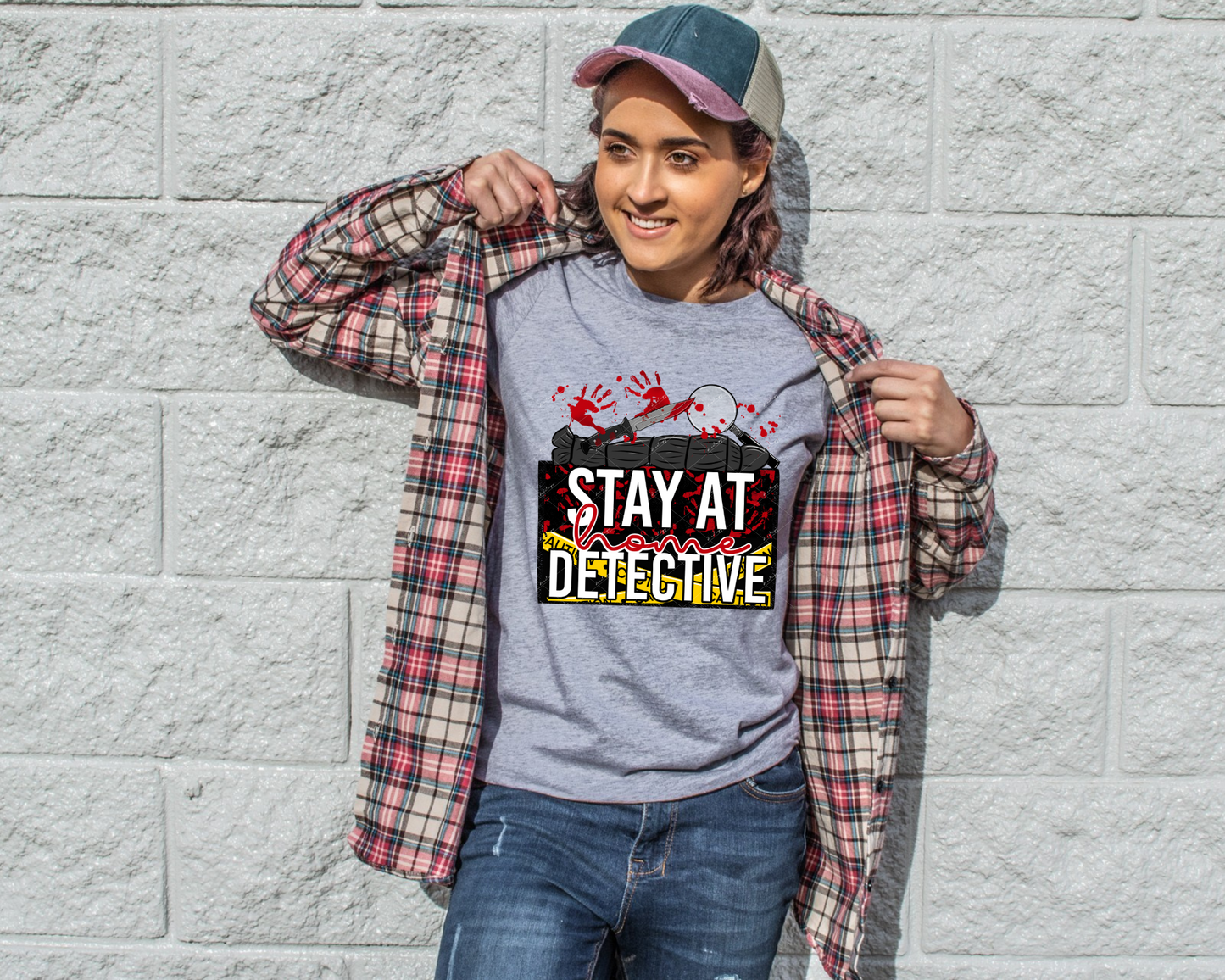 Stay At Home Detective (caution tape, bloody knife, magnifying glass, white block lettering and red handwriting lettering) DTF TRANSFER