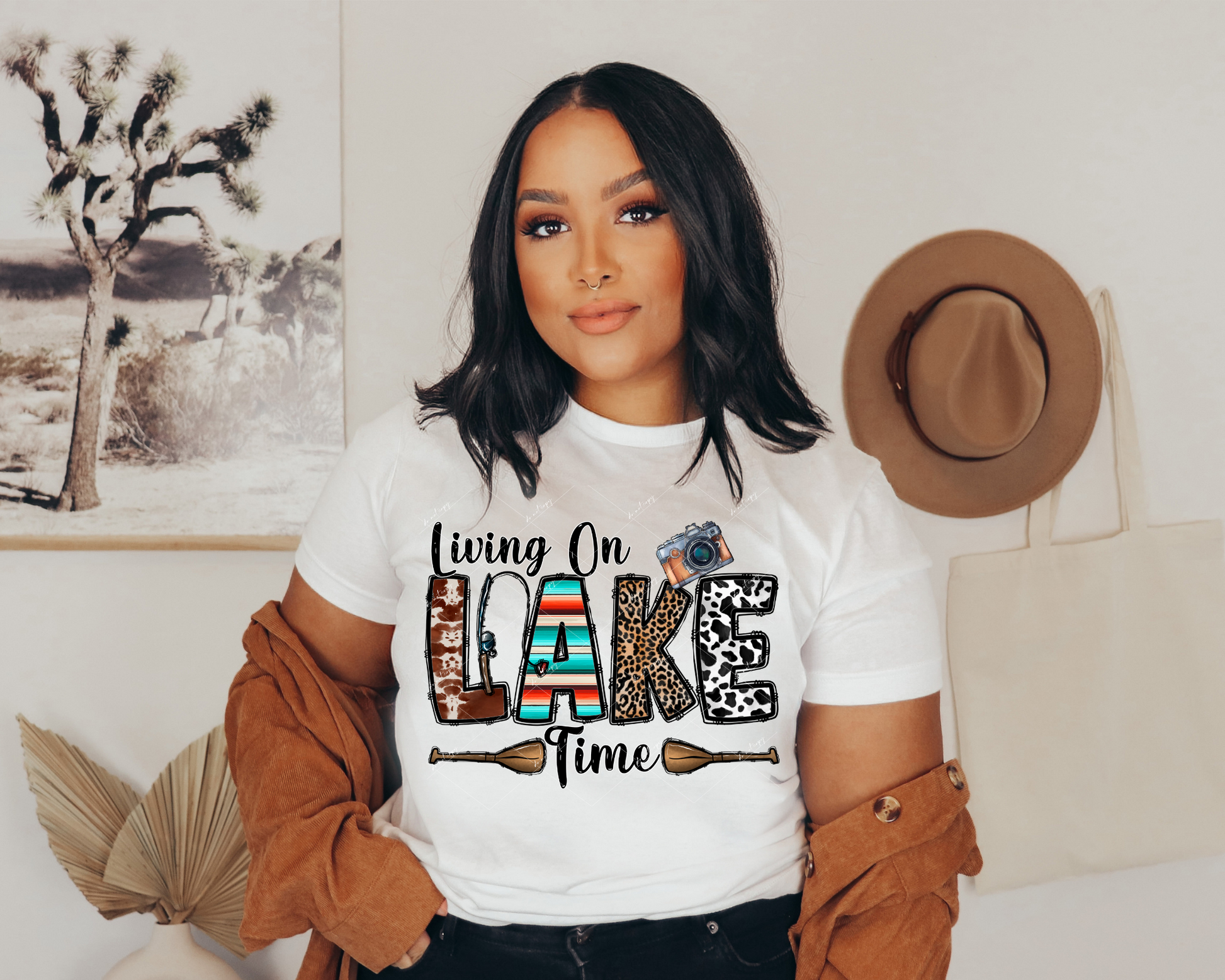 Living On Lake Time (lake elements, camera, filled block lettering with cow print, leopard print, western print, black handwriting) 1688 DTF TRANSFER