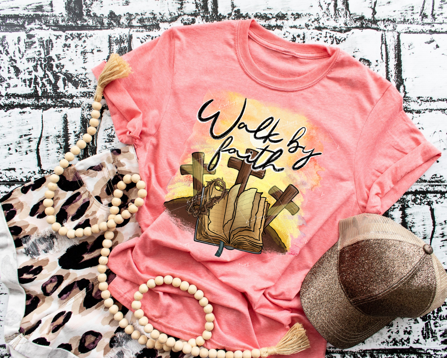 Walk By Faith (three wooden crosses, open book, crown of thorns, black handwriting) 8893 DTF Transfer