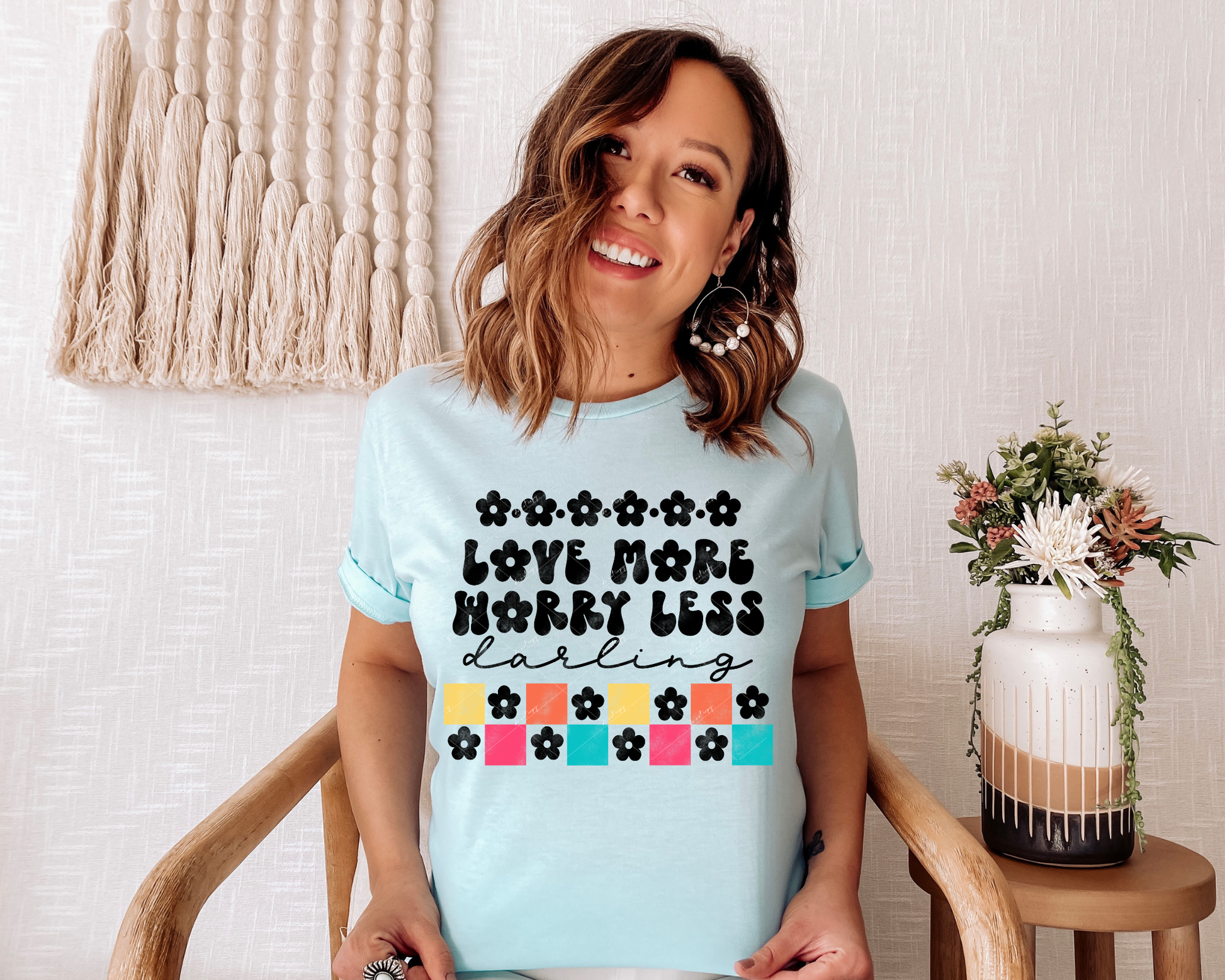 Love more worry less (black lettering, bright checkers, daisies) 1914 DTF TRANSFER
