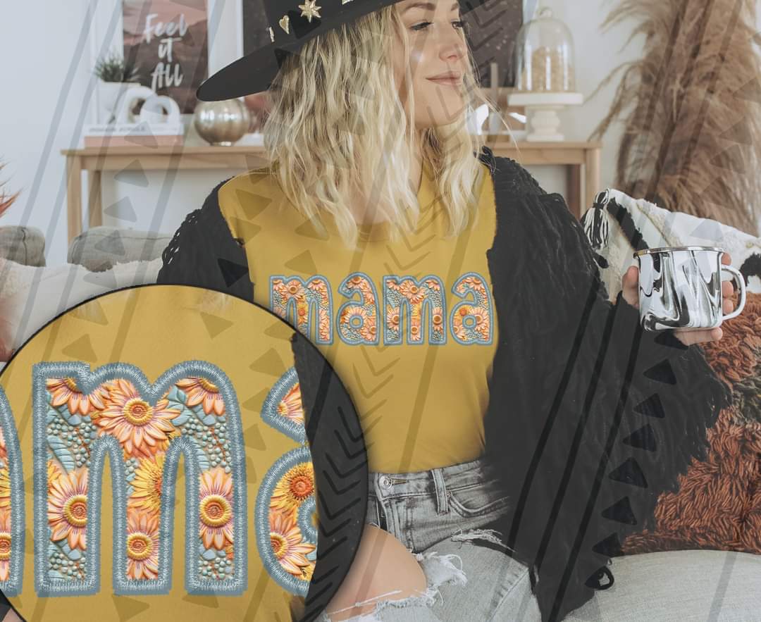 Mama faux embrodiery sunflowers blue outline DTF Transfer