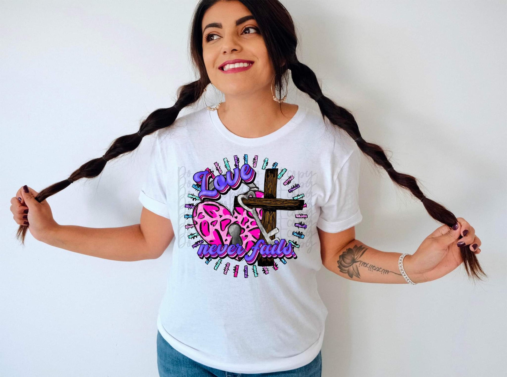 Love never fails purple writing with pink heart and cross DTF TRANSFER