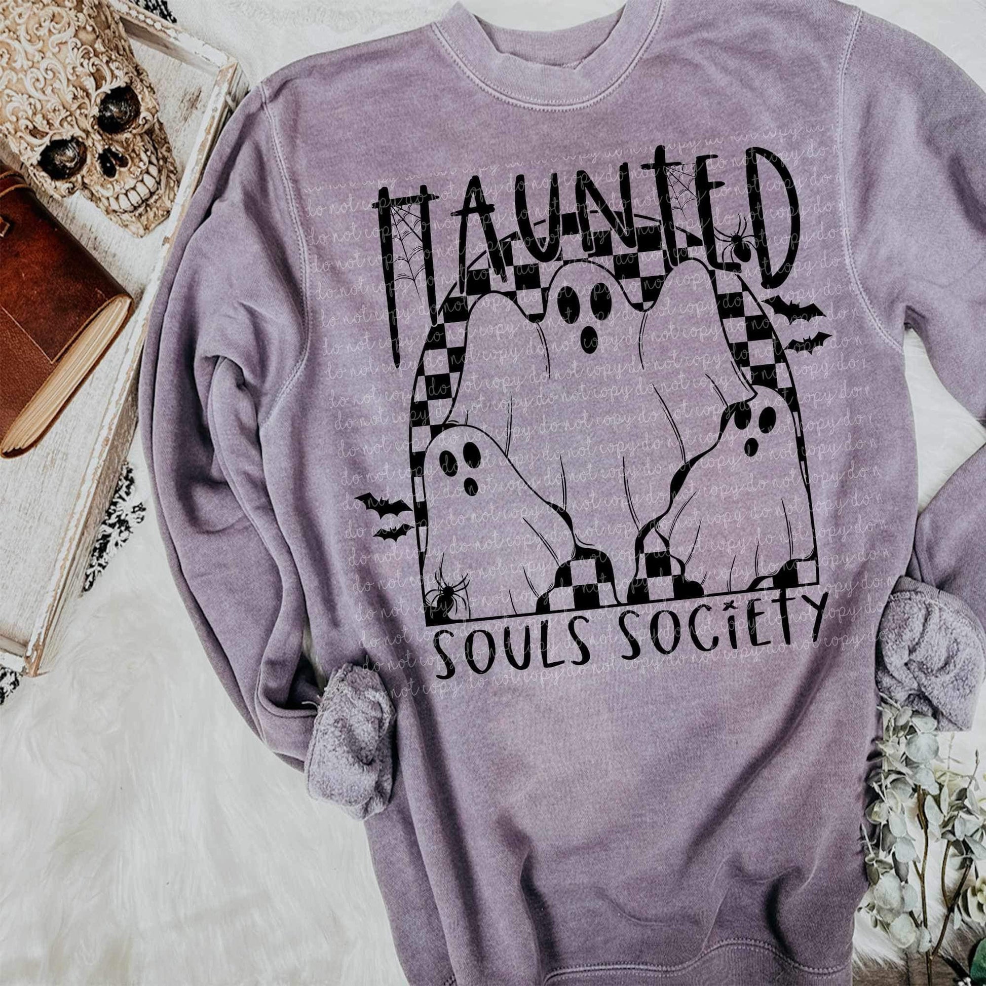 Haunted souls society (BLACK with ghosts and checkered background) 9262 DTF TRANSFERS