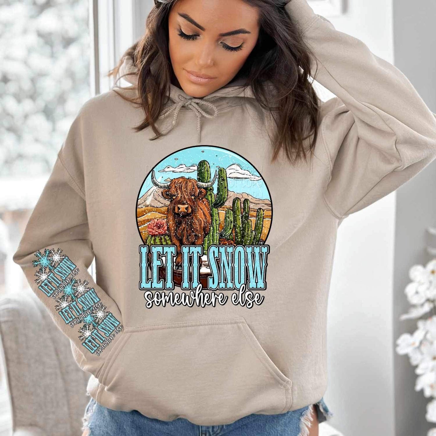 Let it snow somewhere else (western shaggy cow with snowflakes) FRONT ONLY 11242 DTF TRANSFER