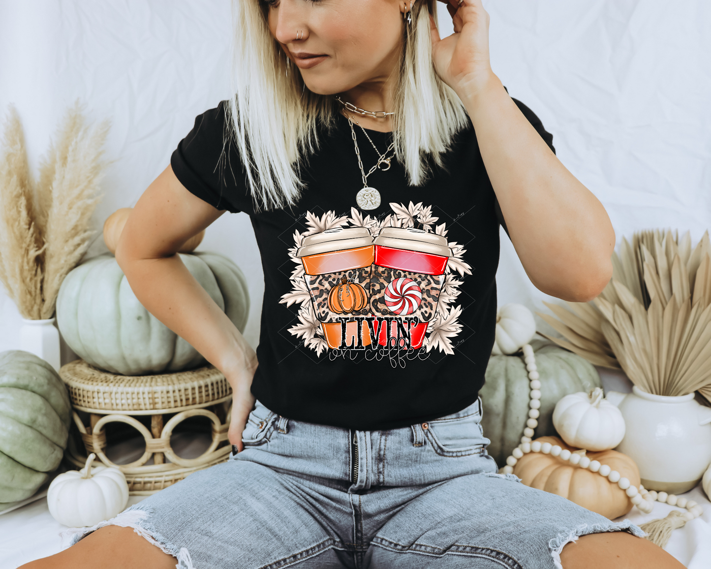 Livin' on coffee (two coffee travel cups, leopard, peppermint, pumpkin) 112215 DTF TRANSFER