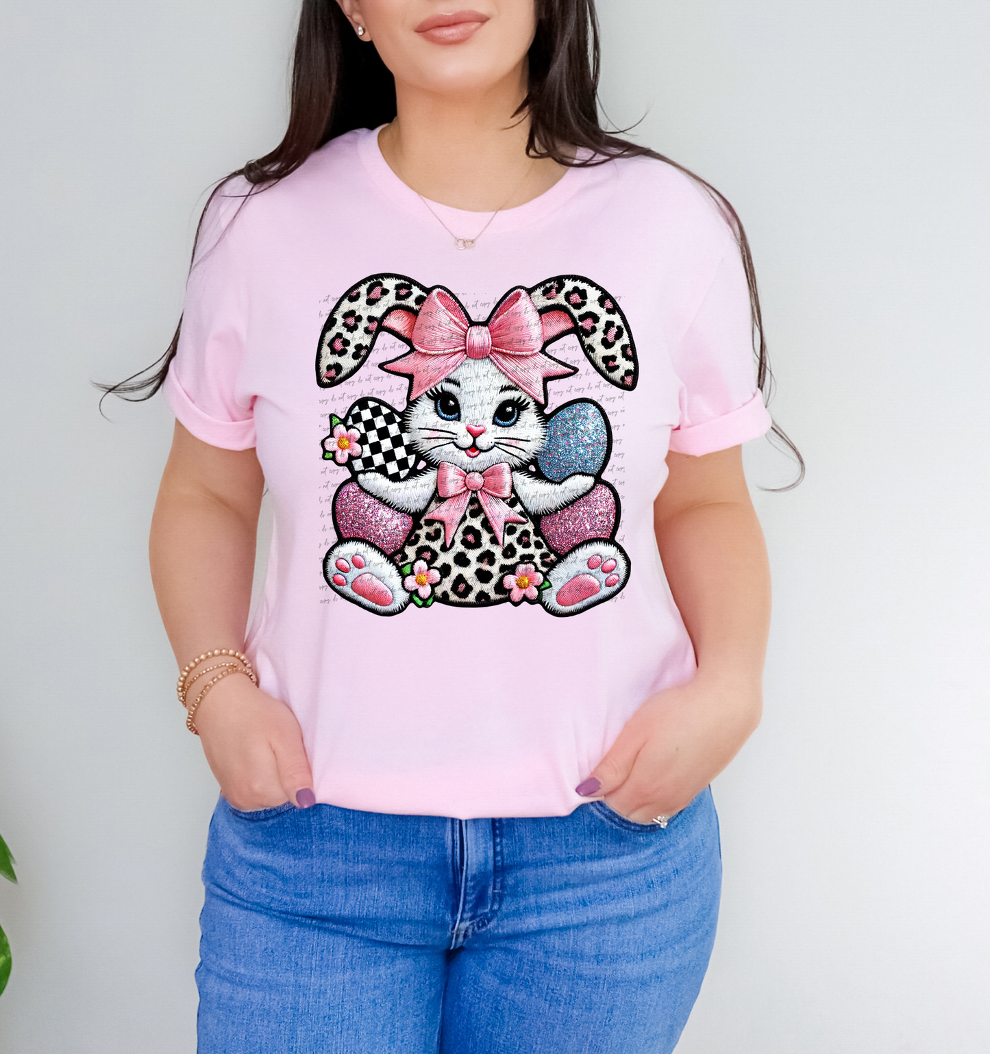 Pink Bow Bunny With Eggs Faux Embroidery 86017 DTF Transfer
