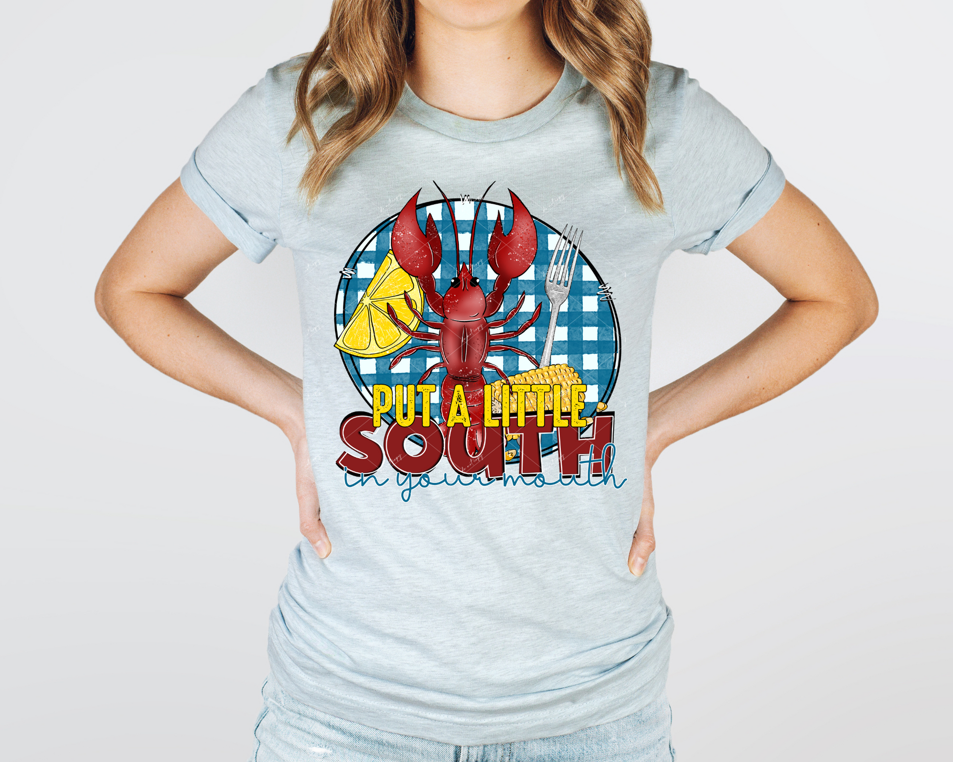 Put a little south in your mouth (crawfish, corn, lemon, blue gingham) 1804 DTF TRANSFER