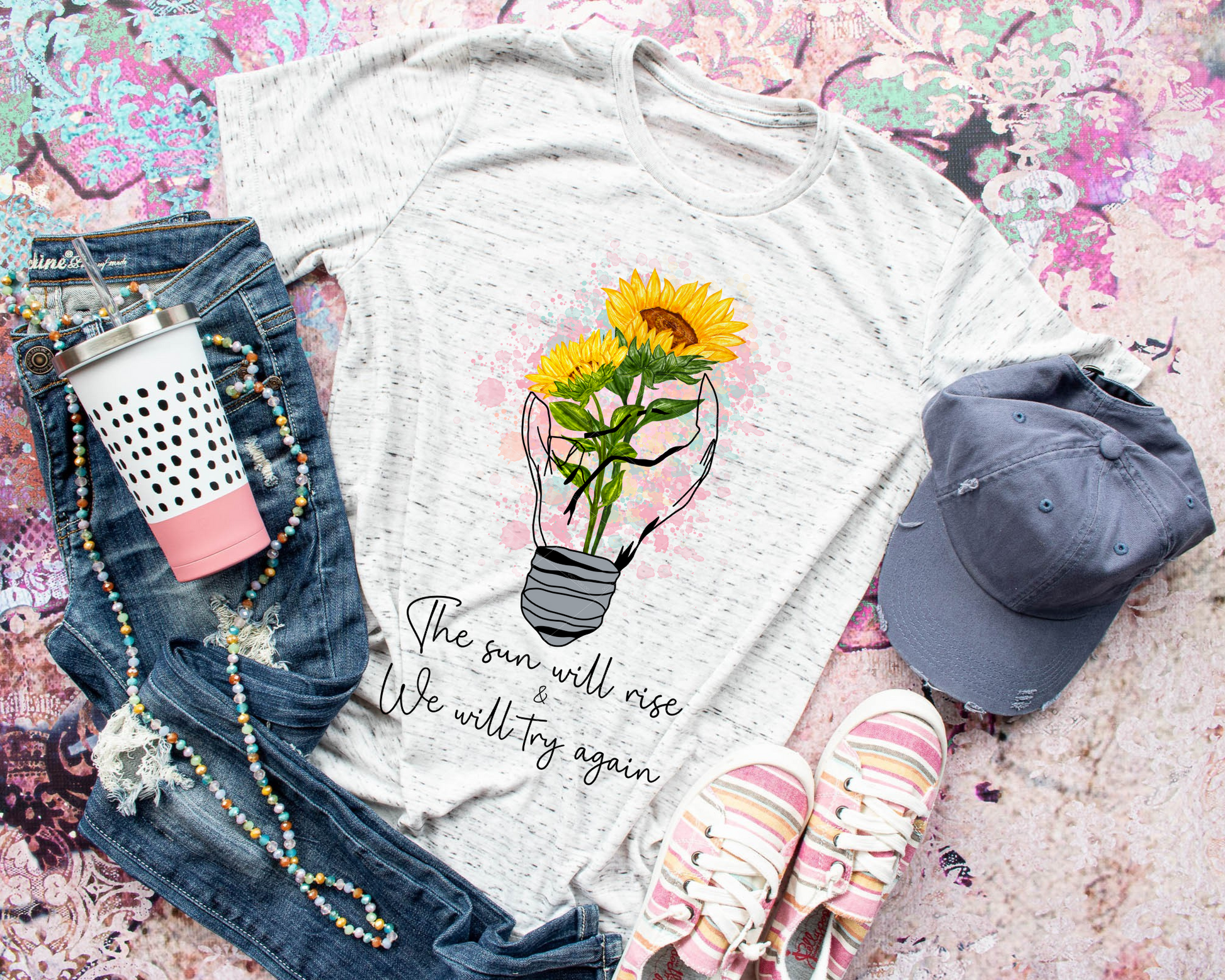 The Sun Will Rise & We Will Try Again Lightbulb Sunflower Black Font 112619 DTF TRANSFER
